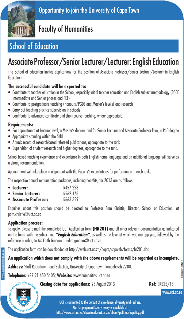 UCT vacancy: Associate Professor/Senior Lecturer/Lecturer English Education