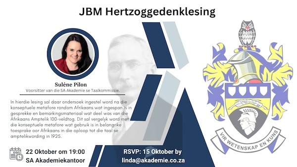 Die Hertzoggedenklesing sal ook regstreeks gestroom word vanaf die SA Akademie se YouTube-kanaal.