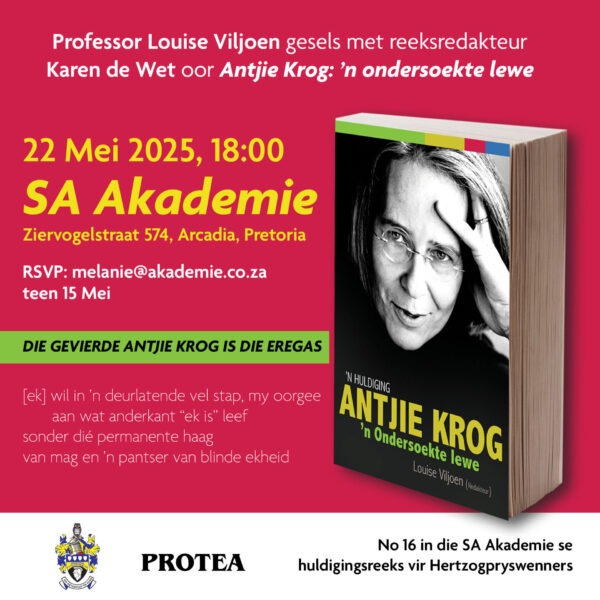 Die SA Akademie nooi u vriendelik na die bekendstelling in Pretoria van Louise Viljoen (red.) se boek Antjie Krog: ’n Ondersoekte lewe. Dit is die sestiende titel in die SA Akademie se huldigingsreeks vir Hertzogpryswenners en die gevierde Antjie Krog is die eregas. RSVP teen 15 Mei.