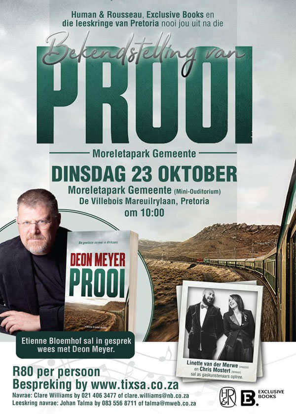 Deon Meyer stel op 23 Oktober sy jongste boek, Prooi, vir die eerste keer bekend tydens die gesamentlike leeskringbyeenkoms van leeskringe in en om Pretoria by die Moreletapark Gemeente in Pretoria. Hierdie sal die heel eerste geleentheid wees om die boek te bekom, selfs voordat dit in die boekwinkels beskikbaar gaan wees.
