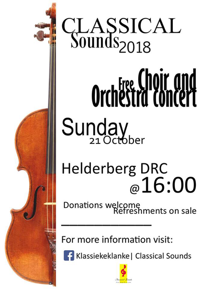 Kom ondersteun asseblief hierdie inisiatief en nooi al die vriende, bure, familie en kennisse wat van musiek hou – daar is iets in almal se smaak en dis boonop gratis! Alle donasies wat ingesamel word, gaan vir die verdere bevordering van klassieke musiek in die Helderberg-area en Helderberg NG Kerk se musiekbedeining. Heerlike verversings word ook voor en na afloop van die konsert verkoop, so kom geniet ’n stuk koek met ’n heerlike koppie koffie in die tent as deel van hierdie Sondagmiddag-uitstappie.