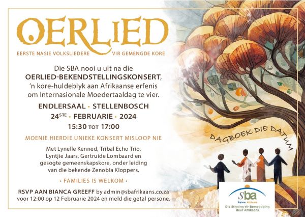 Die SBA nooi u uit na die Oerlied-bekendstellingskonsert, ’n korehuldeblyk aan Afrikaans erfenis om Internasionale Moedertaaldag te vier op 24 Februarie 2024 by die Endlersaal in Stellenbosch.