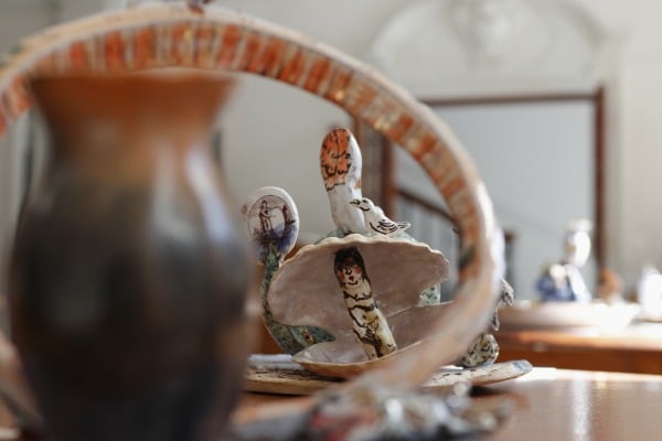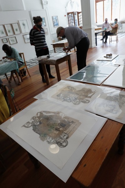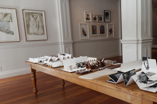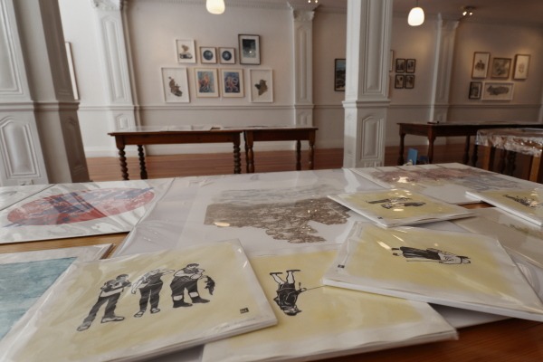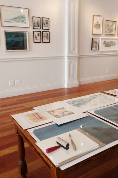 At the table is ’n uitstalling van kontemporêre bedrukte kuns deur die Kaapse groep ThePrintingGirls.