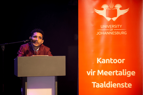 Ashwin Arendse aan die woord by die ontvangs van die 2022 UJ-debuutprys vir Swatland (Foto: UJ Kantoor vir Meertalige Taaldienste)
