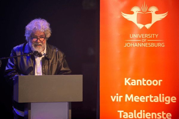 Frederik de Jager aan die woord by die ontvangs van die 2022 UJ-debuutprys vir Man op ’n fiets êrens heen (Foto: UJ Kantoor vir Meertalige Taaldienste)