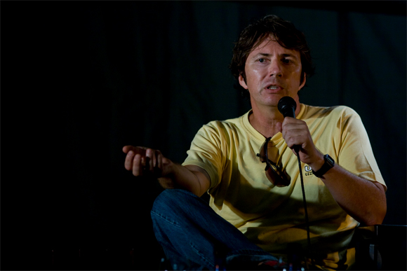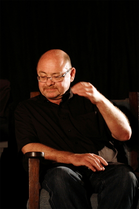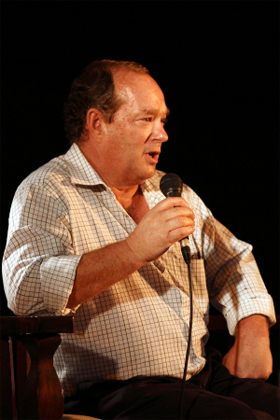 François Bloemhof tydens die gesprek getiteld "Waarom misdaad?" Bloemhof het met hierdie vraag geworstel saam met mede-misdaadskrywers Chanette Paul en Deborah Steinmair. |
