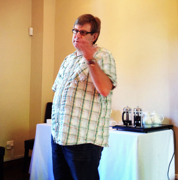 Marius Crous, die aanbieder van LitNet en Sanlam se resensiekliniek, bespreek die fynere kunsies van resensie-skryf met die deelnemers. |