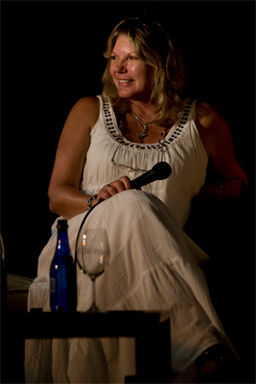 Woordfeesdirekteur Dorothea van Zyl luister na Susan Smith se groen-lesing. |