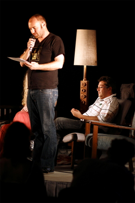 ![]() Die storievuur brand hoog. Gerrit Rautenbach, Ronelda Kamfer, Ulla Pakendorf, Johan Bakkes en Christiaan Bakkes op die verhoog. |