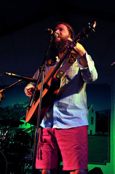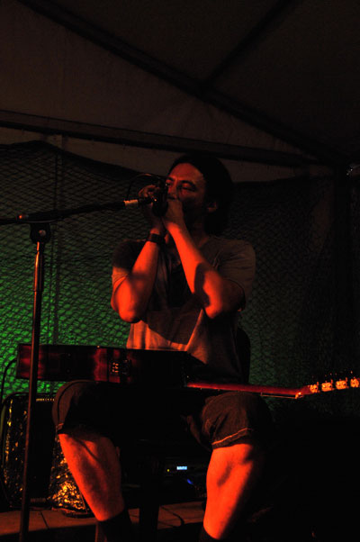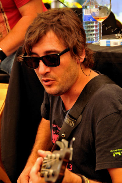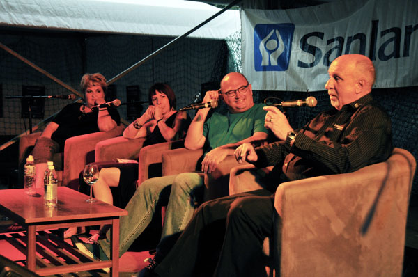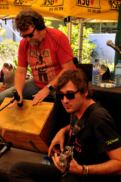 Vernon Swart en Schalk Joubert maak lewendige musiek by die RSG-verhoog tydens 'n Spektrum-uitsending.