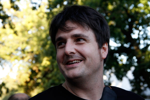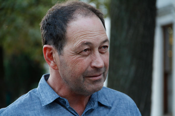 Danie Marais gesien oor Johan Bakkes se skouer, besig met die openingsrede