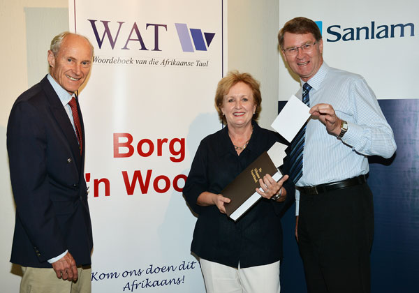 Die WAT se Borg 'n Woord-prystrekking vir die Sanlam-skenking van R25 000 het onlangs plaasgevind. Die gelukkige wenner is DJP Opperman van Kleinmond. Op die foto verskyn Willem Botha, hoofredakteur en uitvoerende direkteur, Erna Meaker, voorsitter van die WAT Trust, en Arnold Schoonwinkel, voorsitter van die direksie van die WAT. Borg 'n Woord gaan steeds voort, en deelnemers ontvang steeds sertifikate, maar kwalifiseer nie meer vir vanjaar se prystrekking nie.