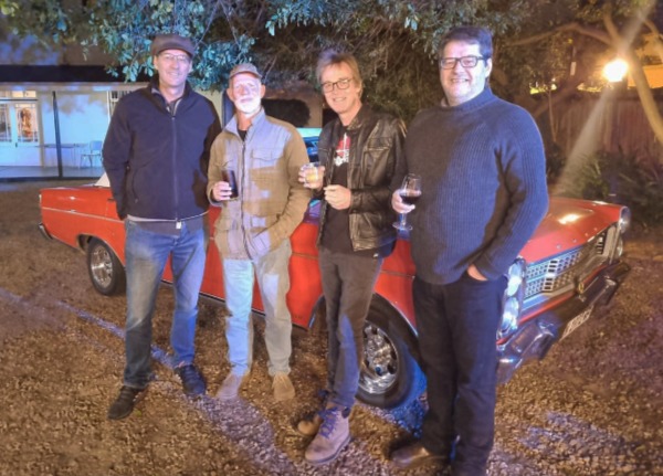 Wellingtonners Louis Duvenage, Jannes Kruger en Bokkie Duvenage was byderhand om hul eertydse skoolvriend se nuutste album te vier. Agter hulle is Duan Rossouw se 1968 Ford. (Foto: Engela Duvenage)