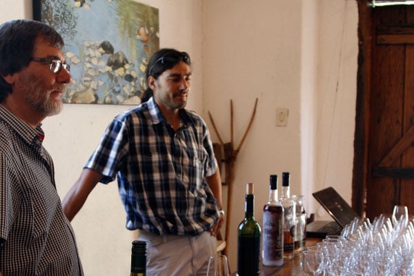 Hier is Johann Loubser, Riana se man, en Charles Stassen, die wynmaker, besig om gaste van die wyn en die brandewyn te vertel. |