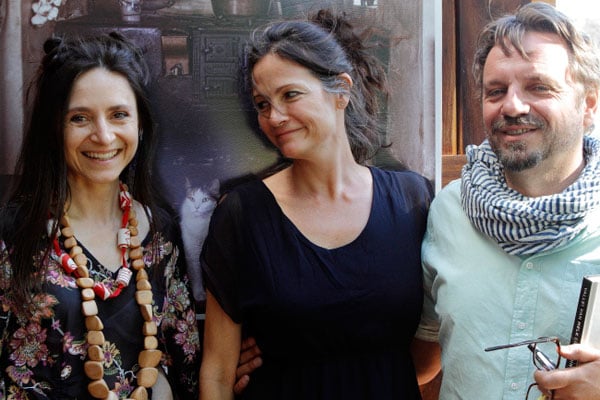 Dedré Fouquet (middel) het haar kunswerk in die kelder uitgestal. Hier gesels sy met Elsibe en Rod McGuffog. |