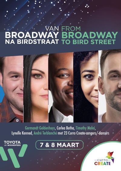 Van Broadway na Birdstraat / From Broadway to Bird Street is 7 Maart 16:00, 7 Maart 20:00 en 8 Maart 11:00 by die Toyota US Woordfees te sien. Kaartjies is teen R100–R200 beskikbaar by Computicket en kos R220 by die deur.
