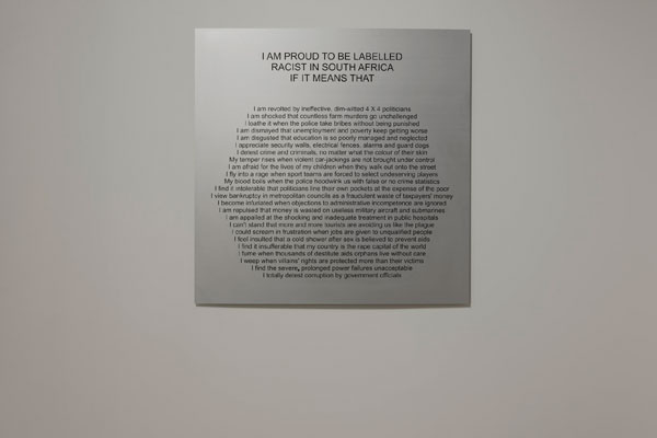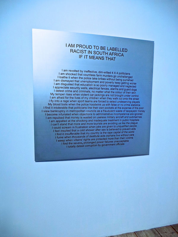 Boshoff se kunswerk is ’n verklaring: “I am proud to be labelled racist in South Africa if it means that I am revolted by ineffective, dim-witted 4x4 politicians/ I am shocked that countless farm murders go unchallenged/ I loathe it when the police take bribes without being punished, I could scream in frustration when jobs are given to unqualified people”, gevolg deur ’n lys van ellendes, vermoedelik vir wit mense, onder ANC-bewind. So ’n verklaring, en dít op die amptelike Suid-Afrikaanse uitstalling en die openingsfunksie aangebied deur die Suid-Afrikaanse konsulaat nogal?