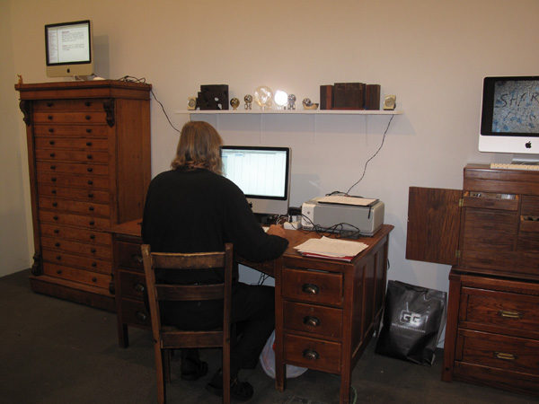 In hedendaagse kuns soos dié van Willem Boshoff en Damien Hirst is daar ’n groeiende belangstelling in argivale metodes (Foster 2004:3). Voorbeelde hiervan is die opstellings wat in Boshoff se Big Druid in his cubicle (2009) (figuur 1) en Hirst se The collector (2003–2004) gedokumenteer is, waar die betrokke kunstenaars (’n pop in die geval van Hirst) as stigters van georganiseerde versamelings voorgestel word.5 In die werklikheid is beide kunstenaars ook stigters van georganiseerde versamelings: Boshoff van sy argief en die verskeidenheid versamelings in sy huis en Hirst van sy reuse-kunsversameling Murderme, waarvoor hy die Newport Street Gallery in Londen laat bou het en waar hy as kurator optree.