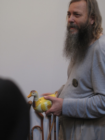 Figuur 6. Willem Boshoff, Big Druid in his cubicle (die Druïde met sy speelgoedeend “Lucky”) (Art Basel / Basel Art Fair, 2009) © 2016 Willem Boshoff / Universiteit van die Vrystaat