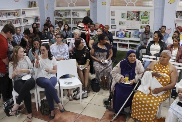 Tannie Flori in geel, heel regs, en tannie Koelsom langs haar. Kort na hierdie foto geneem is, het Nanette aan elkeen van hulle ’n getekende kopie van die boek oorhandig.