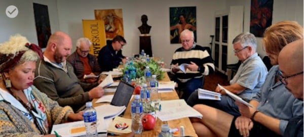 Die digters by die ATKV Digskool in die Louwhuis se Sentrum vir Digkuns luister aandagtig luister terwyl prof. Bernard Odendaal aan die woord is. Links is Lynthia Julius, die gasdigter. Derde van regs is Robert Schall wat Klipwerk van N.P. van Wyk Louw in Duits vertaal het.