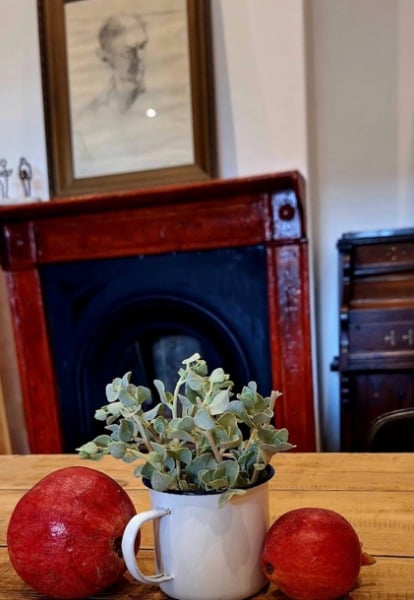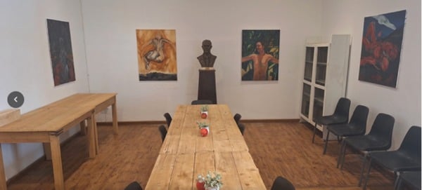 Skoongeskropte tafels in die Sentrum vir Digkuns met skilderye deur André Roothman, geïnspireer deur gedigte van die Louwbroers.