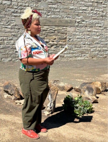 Nadat Lynthia Julius ’n krans vir N.P. van Wyk Louw gelê het, lees sy haar gedig Namakwaland-dorp: someraand, ’n parodie op Karoo-dorp : Someraand van N.P van Wyk Louw.