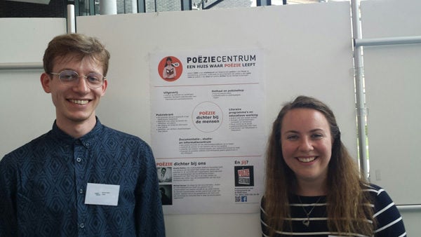 Giselle en haar Poolse kollega, Michał Hynas, by hul plakkaat van die Poëziecentrum wat ’n prys gewen het