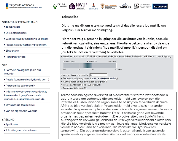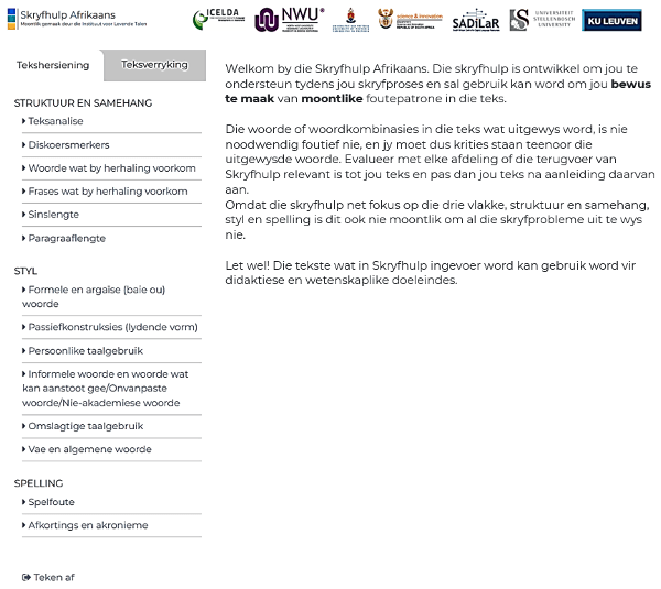 Die navorsers bou voort op die werk van die Universiteit van Leuven, wat Skryfhulp7 ontwerp het. Dit is ’n ASA wat in 2015 ontwerp is vir Nederlandse akademiese skryf en in 2016 begin gebruik is (Harari 2018). Die Engelse digitale hulp kon nie in die behoeftes van die Nederlandse studente voorsien nie en daarom het die Universiteit van Leuven nuwe toepassings geskep – toepassings wat aan die realiteit van hul akademiese behoeftes moes voldoen. Daaruit is Schrijfhulp gebore (Van Dyk, Louw, Taljard en Cloete 2021). Schrijfhulp is in samewerking met ander universiteite, onder andere die Universiteit van Pretoria en die Universiteit Stellenbosch, as Skryfhulp vertaal en aan alle Afrikaanssprekende studente beskikbaar gestel (Van Dyk e.a. 2021). Die projek is befonds deur The South African Centre for Digital Language Resources (SADiLaR) en staan as Skryfhulp Afrikaans8 bekend. Vervolgens enkele voorbeelde oor die funksies van Skryfhulp: