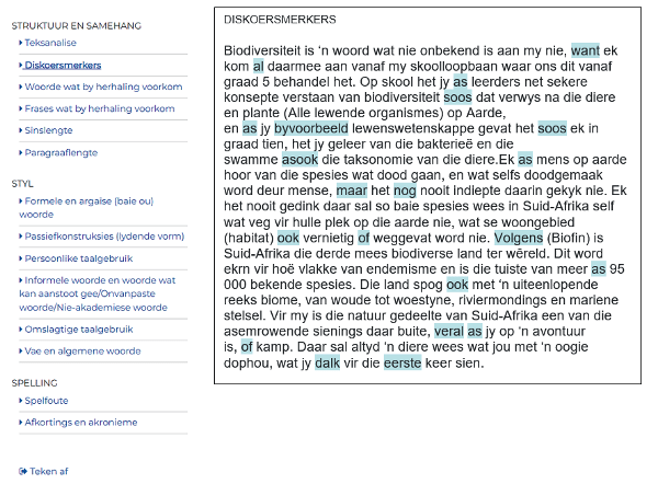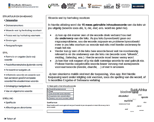 Keywords: academic writing assistant; Afrikaans; discourse markers; grammar; passive construction; punctuation; repetition; Skryfhulp; spelling; writing; word meaning