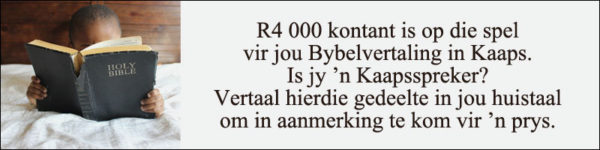 ’n Paa wieke trug comment ’n vrou op een van my Kaapse Bybelvetalings op LitNet. Sy sê of vra toe hoekô issit nodig dat die Bybel in die “Veil Afrikaans” (dis nou hoe ekkit vestaan het) vetaal moet wôd? Sy gan toe an om te sê maa “hulle” vestaan mos amal Afrikaans. Nou vi wat moet dinge soe gedoen wôd? Toe ek klaa die comment gelies het, toe vra ek myself maa hoekô is dit rêrig nodig dat die Bybel soe besmet moet wôd, met die “veil” Kaaps. Ek het toe gedink dat wel, miskien het sy ’n punt beet, wan hoekô wil ôs dan nou rêrig dié pad loep? En net soe by da way, diésie die eeste kee dat iemand wattie Kaaps praatie, soe sleg praat oo Kaaps. Ek gloe stellig dit sal oekie die laaste kee wiesie.