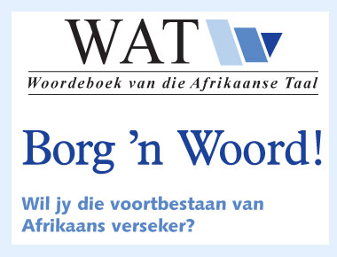 Jy kan ook ’n woord vir R100 borg en dalk R25 000 in die prystrekking wen. En jy kry ’n sertifikaat met jou naam en woord of woorde daarop. Streektaalwoorde en -uitdrukkings kan gerus aan ons gestuur word. Dit is vir ons net so belangrik soos Standaardafrikaans.