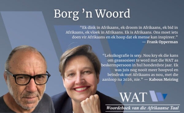 In aanloop tot die Woordeboek van die Afrikaanse Taal se eeufeesviering in 2026, is daar vanjaar twee bekende persoonlikhede uit die Afrikaanse kultuurwêreld as beskermpersone van die WAT se Borg ’n Woord-projek aangewys. Kabous Meiring en Frank Opperman is op 16 Oktober, Internasionale Woordeboekdag, aangekondig as beskermpersone vir die volgende jaar.