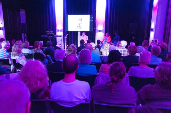 Ena Jansen, Ingrid Glorie en Randall Maarman (voor, heel links, in die gehoor: Lindsay Louis)