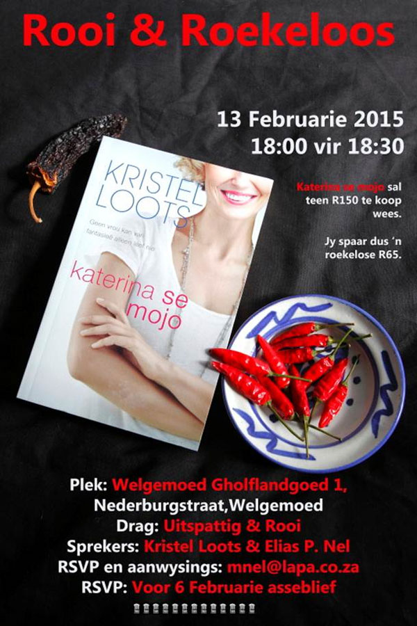 Kom vier asseblief Kristel Loots se nuutste roman met ons. Die tema is rooi en roekeloos.