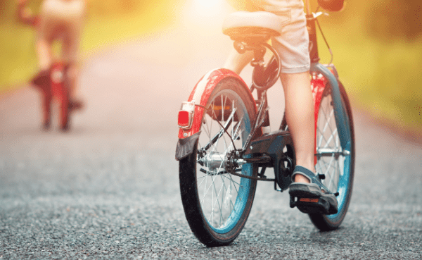 Die kind spring op sy fiets, pap wiel en al, en trap.