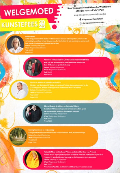 Antjie Krog se praatjie by Boek en Koek is uitverkoop. Daar is egter nog R75-kaartjies oor (sonder die koek). Daar is ook nog net ’n paar kaartjies oor vir Nataniël se vertoning.