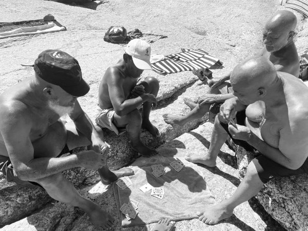 “En sê daar vir die mense daar in jou storie dat ek het daai jare al die beach ingebreek!” (Tell the people, in your writing, that many years ago I was one of the first people of colour to come to this beach!), bellows Uncle Gamiet “Goya” Lucas to me, as he throws a jack of spades onto the pink towel.