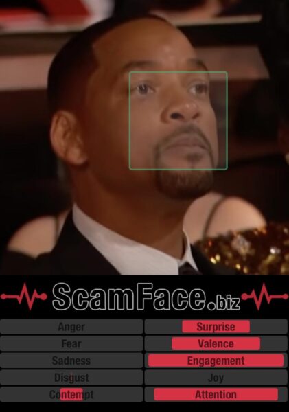 Figuur 1. Will Smith se gesig net na hy “Keep my wife’s name out of your f****** mouth!” geskree het. Gesigsontleding deur die toepassing ScamFace.