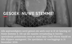 Charl-Pierre Naudé en Bibi Slippers stel Nuwe Stemme 6 saam. Dit sal die nuutste versameling in hierdie opwindende poësiereeks wees. Alle aspirantdigters word genooi om werk voor te lê vir keuring.