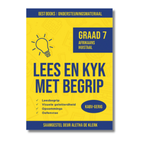 Die Lees en kyk met begrip-reeks vir die seniorfase bied splinternuwe KABV-gerigte geskrewe en visuele tekste om leerders se leesbegrip te versterk. Huistaalleerders in graad 7 sal aanklank vind by die inhoud wat met sorg uitgesoek is om aan te sluit by hul ervaringswêreld en taalvermoëns. Materiaal wissel van artikels en berigte tot advertensies, strokiesprente, spotprente, plakkate, grafieke en opsommings.