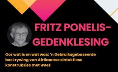 Alle belangstellendes word uitgenooi na vanjaar se Fritz Ponelis-gedenklesing op 30 Julie in Stellenbosch. Die spreker is Suléne Pilon en die onderwerp is: "Oor wat is en wat was: ’n gebruiksgebaseerde beskrywing van Afrikaanse sintaktiese konstruksies met wees".