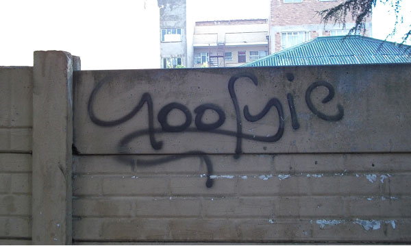 Ek en my gesin woon in Webbstraat. Dit het ontaard in ’n taxiroete ─ vanaf 5vm kom toeterende minibusse verby. Die huis oorkant ons word deur ’n klomp Zimbabwiërs gehuur. Daar is al vir jare dié graffiti teen hulle muur: Goofyie. Seker daar gespuit deur ’n junkie. Goofyie is beter as fobie.